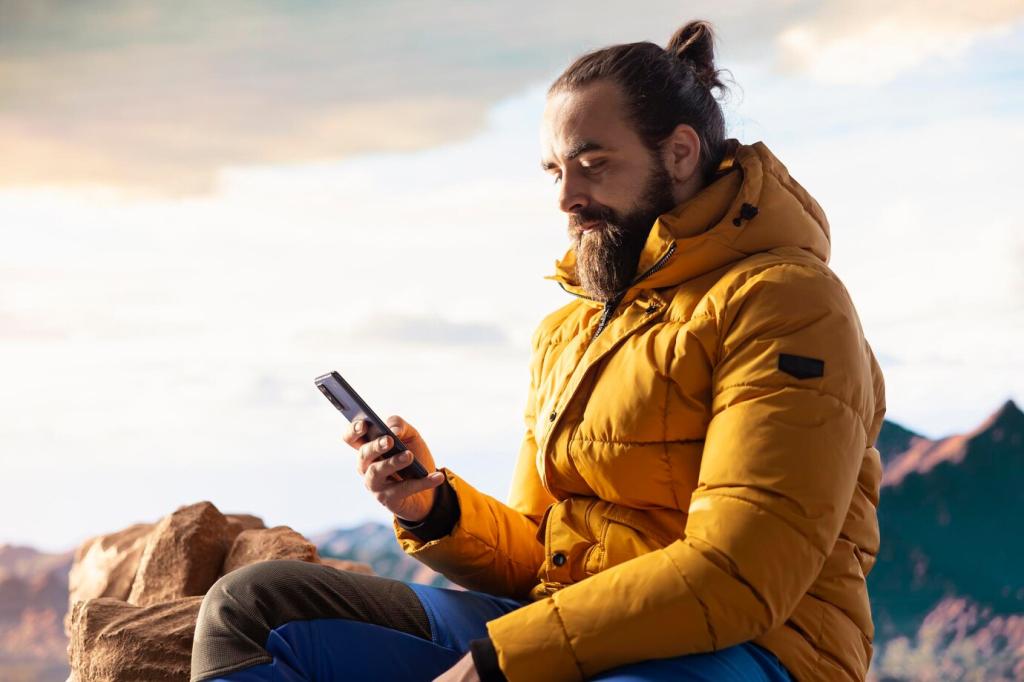 Lade Karten offline, aktiviere den Flugmodus und reduziere Bildschirmhelligkeit. Eine kleine Powerbank hält Handy und Uhr am Leben. Packe die Stirnlampe ein, selbst bei frühen Starts – der Rückweg wird manchmal länger, als die Vorfreude am Parkplatz verspricht.