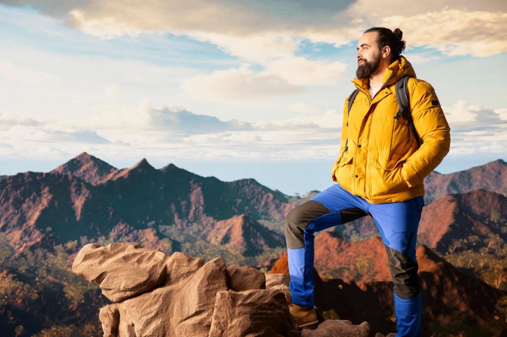 Frühlingsschauer sind launisch. Eine Hardshell mit solider Wassersäule, justierbarer Kapuze und Unterarmbelüftungen bietet verlässlichen Schutz. Achte auf gut sitzende Ärmelbündchen und ausreichend Länge, damit nichts hochrutscht, wenn du Stöcke einsetzt oder steile Stufen nimmst.